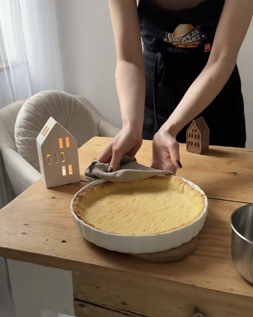 Az omlós tésztához a liszteket, porcukrot és sót összekeverem, majd a vajjal elmorzsolom. Hozzáadom a tojást, gyorsan összegyúrom, fóliába csomagolom, és hűtőbe teszem egy órára. Ezután a tésztát lisztezett deszkán kinyújtom, lisztezett 24 cm-es piteformába simítom, villával megszurkálom és nehezékkel együtt, vakon elősütöm 180 fokon (alsó-felső) sütőben 15 percig, majd nehezék nélkül további 5 percig.