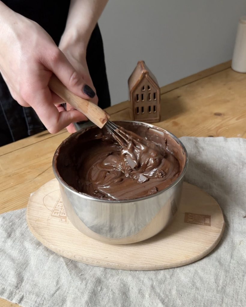 A csokoládékrémhez a tejet megmelegítem, a cukrozatlan és átszitált kakaóport, a kristálycukrot, a sót és az átszitált keményítőt kézi habverővel elkeverem, hozzáadom a tojásokat, majd a forró tejjel összekeverem és kevergetve sűrűre főzöm 4-5 perc alatt. A végén jöhet hozzá a vaj és az étcsokoládé, ettől lesz igazán fényes és krémes.