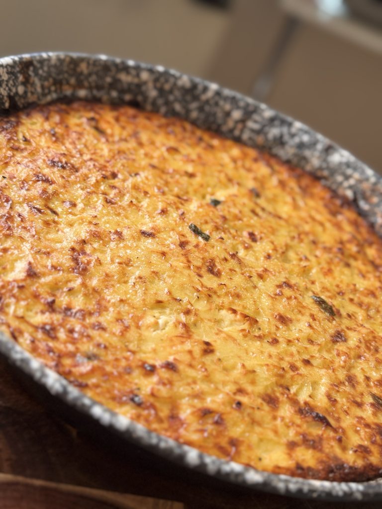 A masszába keverjük bele: a reszelt hagymát, a morzsolt sajtot, a 4db tojást, a mentát, borsot, szükség szerint sót (figyeljünk, mert a sajt sós) – jól dolgozzuk össze. Jól nyomkodjuk bele a vajazott-lisztezett serpenyőbe, egyenletesen eloszlatva, és lapítsuk el a tetejét.